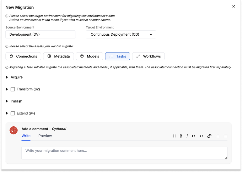 Data Migration Asset ExpansionThis update extends migration capabilities to include Workflows, Acquisition Tasks for Fivetran Sources, Extend Tasks, and Publish Tasks. Seamless promote all of your asset types across environments with ease and without fear of manual error.