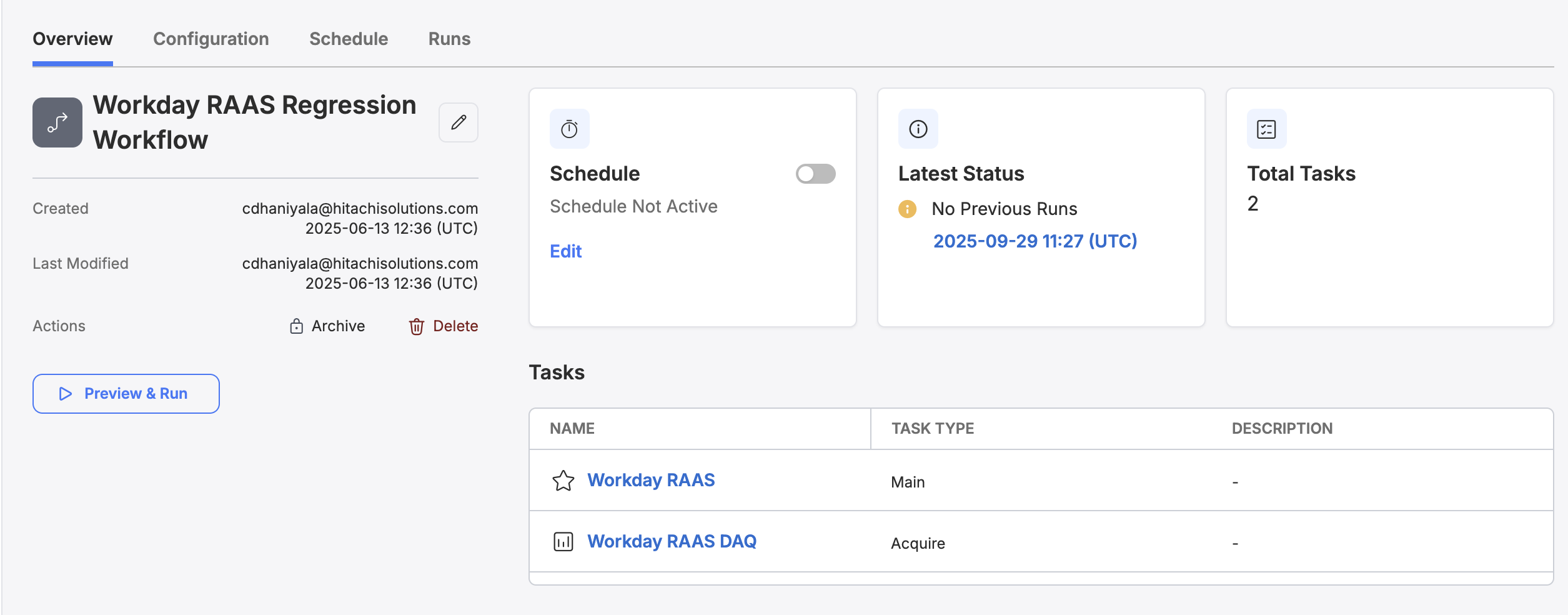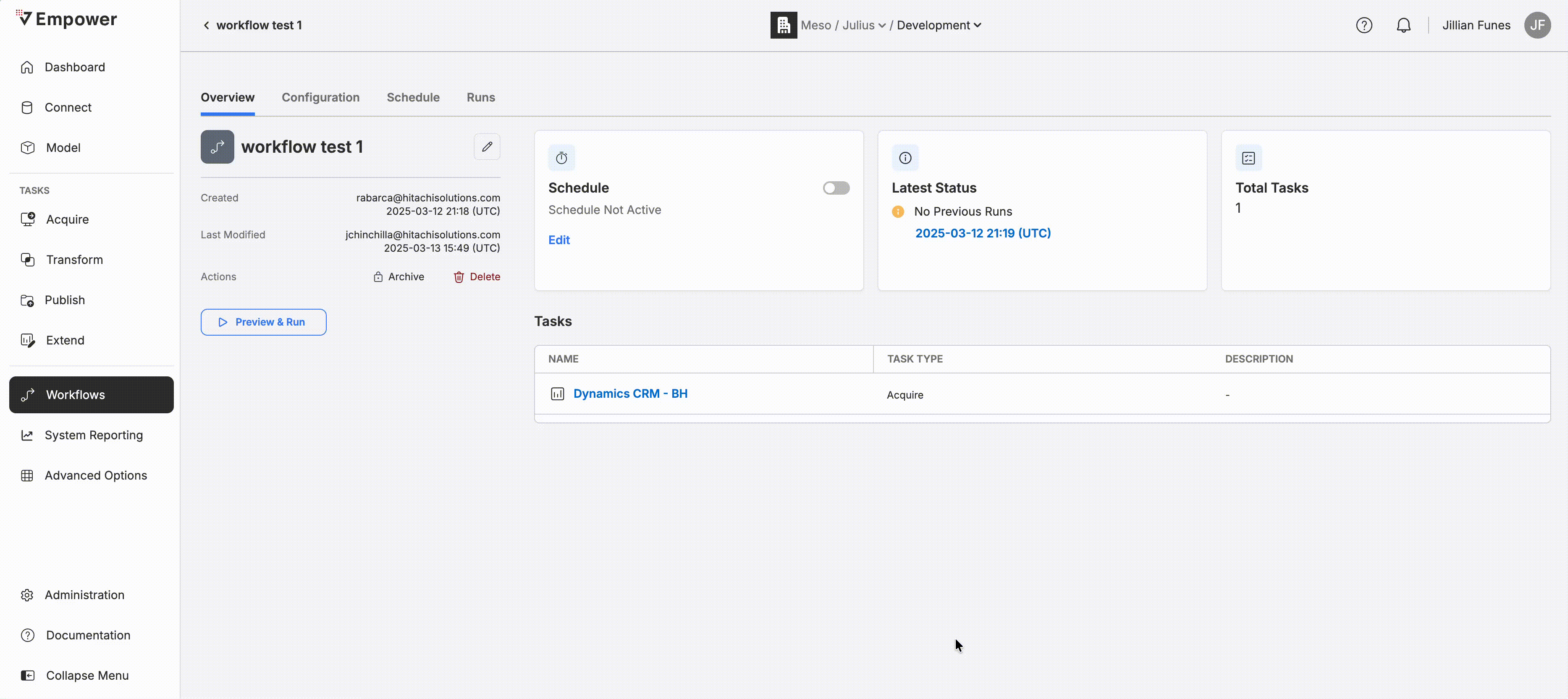 Click on the Preview Run button from the Workflow configuration screen to do a one-time, manual run.