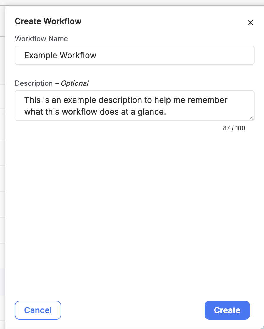 When picking a Workflow name, you want to choose something that is concise, but descriptive. This will help you more easily and quickly identify it when monitoring and managing it in the future.