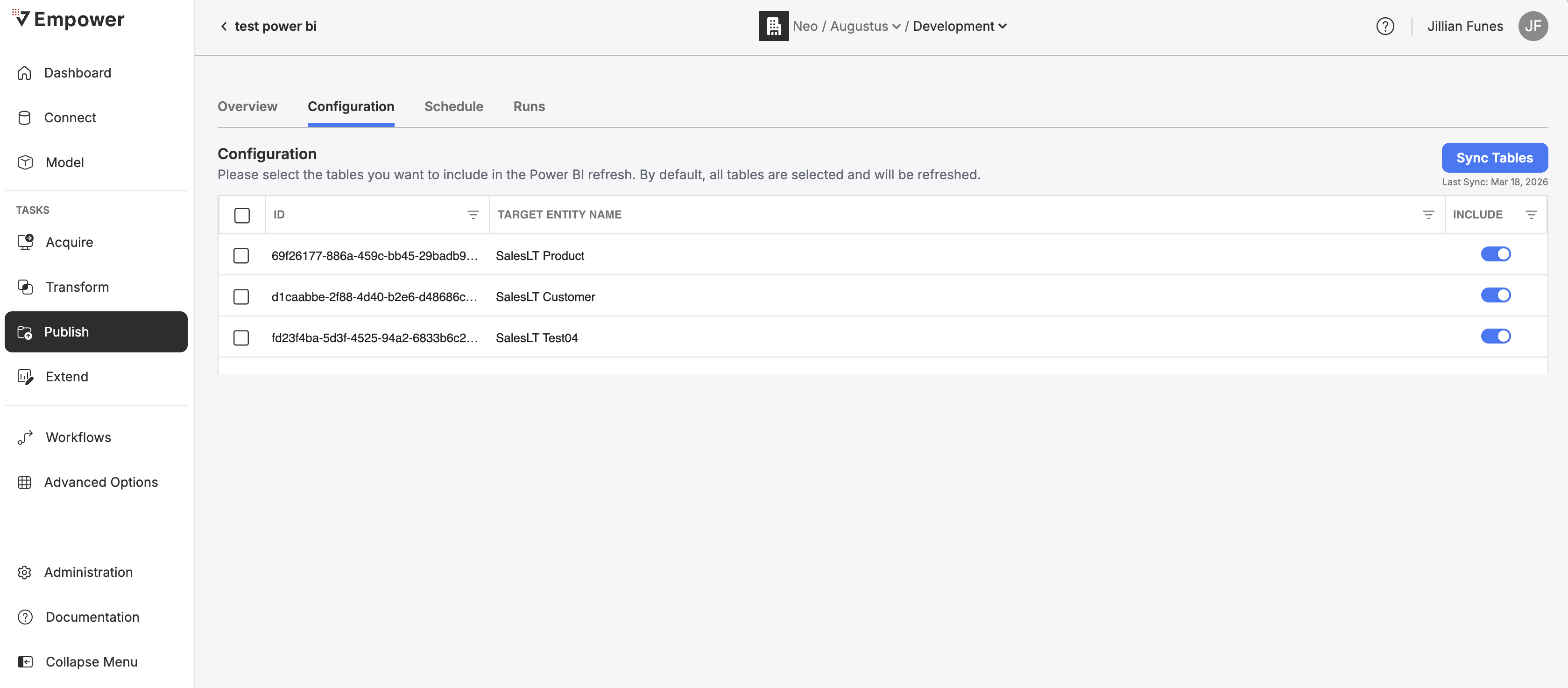 The Configuration tab for a Refresh Power BI Task allow you to toggle on or off individual tables within the associated dataset that you want included to be refreshed when the Task runs.