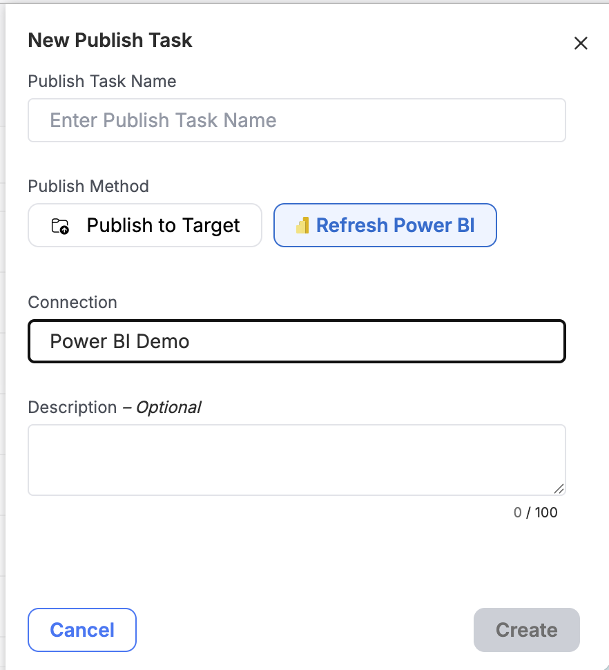Choosing "Refresh PowerBI" will allow you automatically refresh a Microsoft PowerBI Dataset.