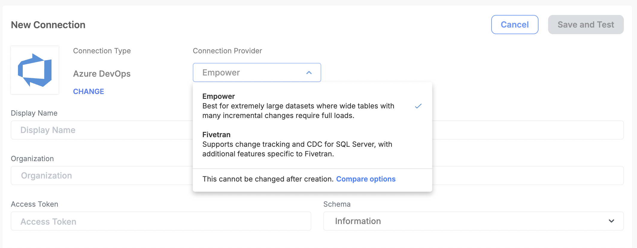 Since this connection type is also supported by Fivetran, we can see a dropdown to select between Fivetran or Empower providers.