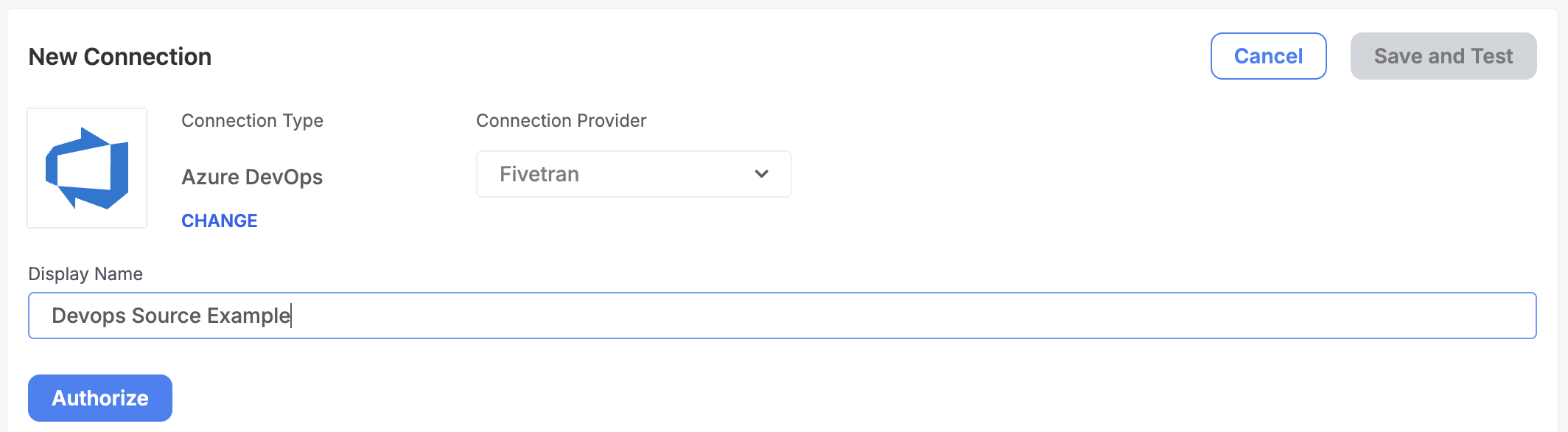 Selecting Fivetran will remove the majority of the fields except for the Display Name. It will also visualize an Authorize button, which you need to click in order to create this connection.