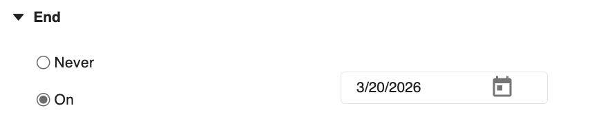 On: Choose a date for Workflow runs to end and then no longer run schedule after the date provided. In the example below, the final opportunity for the Workflow to run would be 3/19/2026 at 11:59:59pm. Once that run concludes, the Workflow will no longer trigger automatically. You will still have the option to go in and change this if you'd like it to start running again.