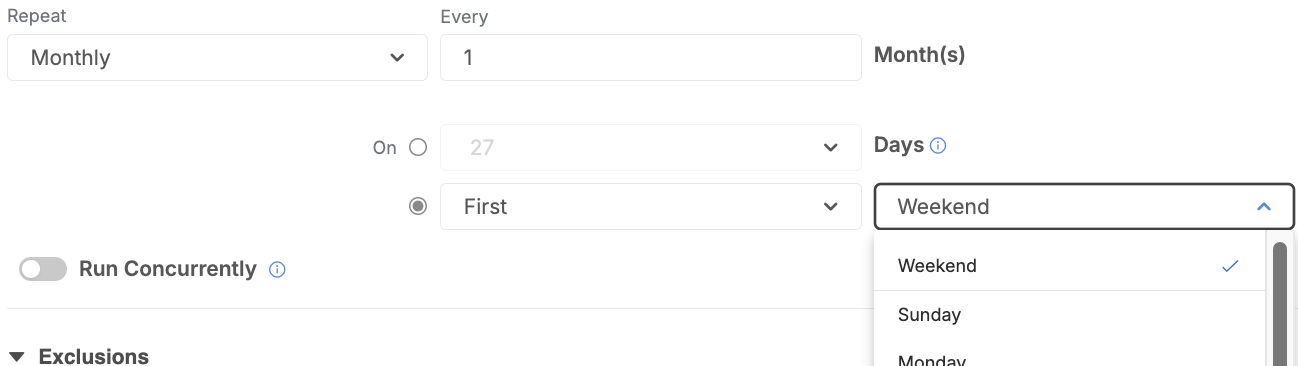 Recurring: Choose the first or last: day, weekend, or specific day of the week in the month to exclude runs on.