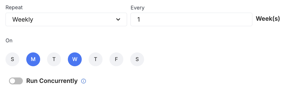 Weekly: Will provide a day of the week selector. In the exmaple below, this will allow you to run every week on Mondays and Wednesday at the provided start time.