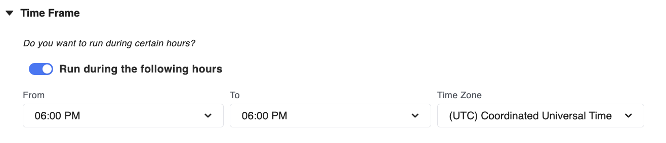 Example: If you choose to run every hour and then enable the Time Frame selection with 6p-6a, the Workflow will run every hour from 6am-6pm where the last run will start no later than 5:59:59pm. The Workflow will then pause until 6am the following day where it will begin to run hourly again.