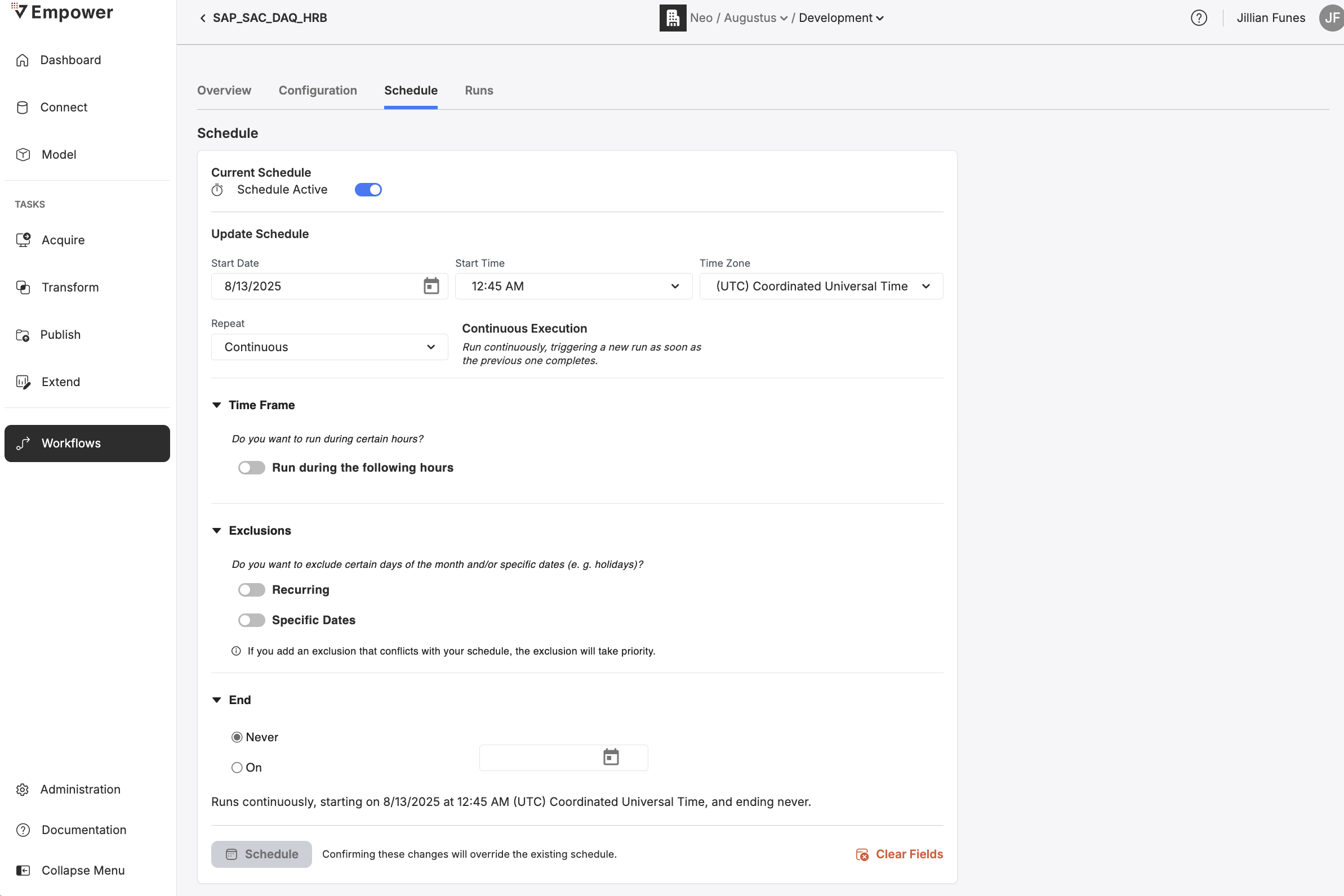 💡 TIP: Given the complex and granular nature of the scheduling inputs, it is possible to input conflicting rules, especially as it pertains to exclusions, that will prevent the Workflow from ever running. It is important to double check your inputs for accuracy before saving.