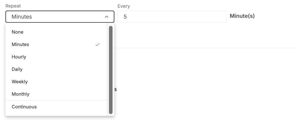 Minutes, Hourly, Daily, Weekly, Monthly: Will provide you an "Every" numeric input to run on the provided interval. For example, if you select Hourly and input 2, the Workflow will run every 2 Hours.